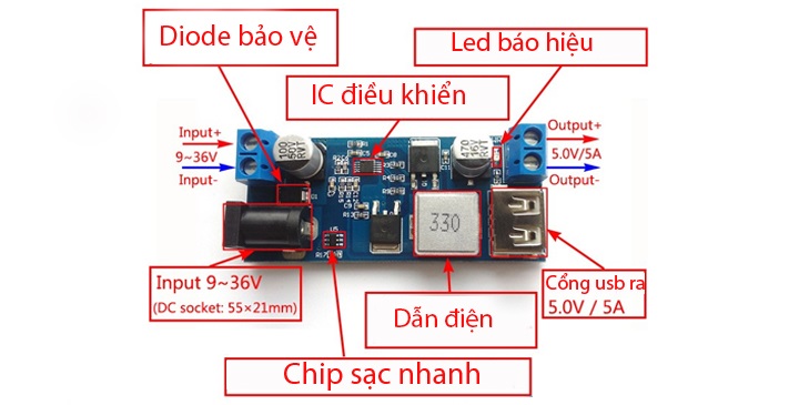 Mạch giảm áp Buck DC-DC Vin 9-36V Vout 5V 5A sạc nhanh có bảo vệ là bộ chuyển đổi điện áp từ 9-36V xuống điên áp 5V với dòng điện là 5A.