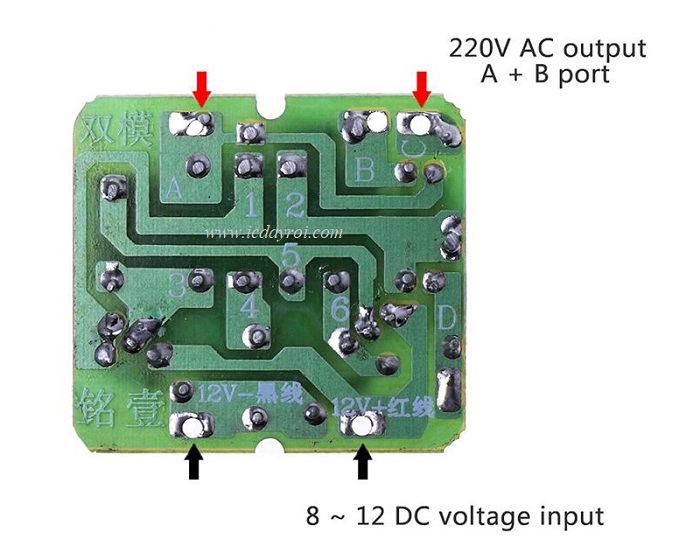 - Điện áp vào mắc vào 2 chân: 12V +, 12V-